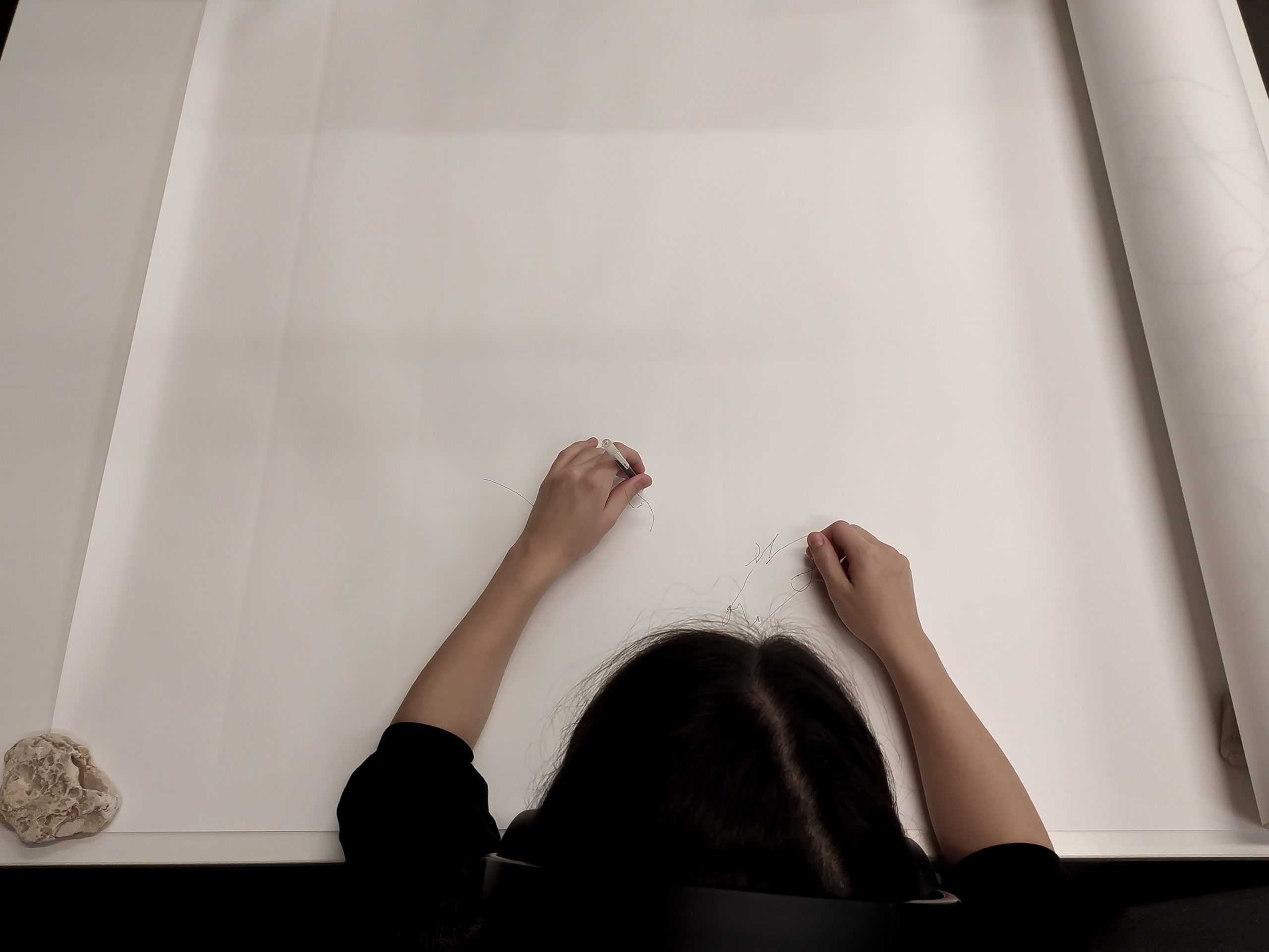 rys. Rysunek odręczny wykonany przez Mariannę Zabawę, powstały w trakcie doświadczenia oddechowo-rysunkowego z zamkniętymi oczami. Jest on częścią cyklu rysunków odręcznych uczestników wydarzenia DECH wykonanych na rolce papieru o wymiarach 10 m x 0,5 m.