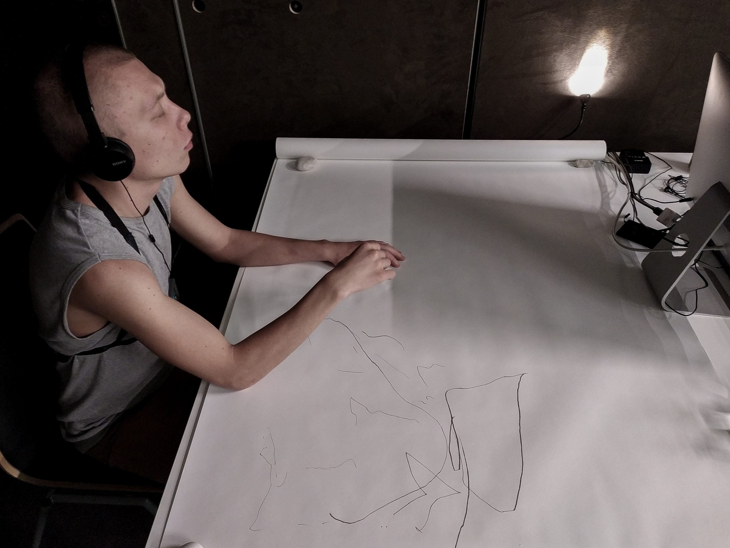 Dokumentacja wideo prezentująca najważniejsze etapy generowania rysunku przez algorytm. Algorytm wygenerował 10 660 klatek interpretując 18 minut nagrania oddechu uczestnika.
