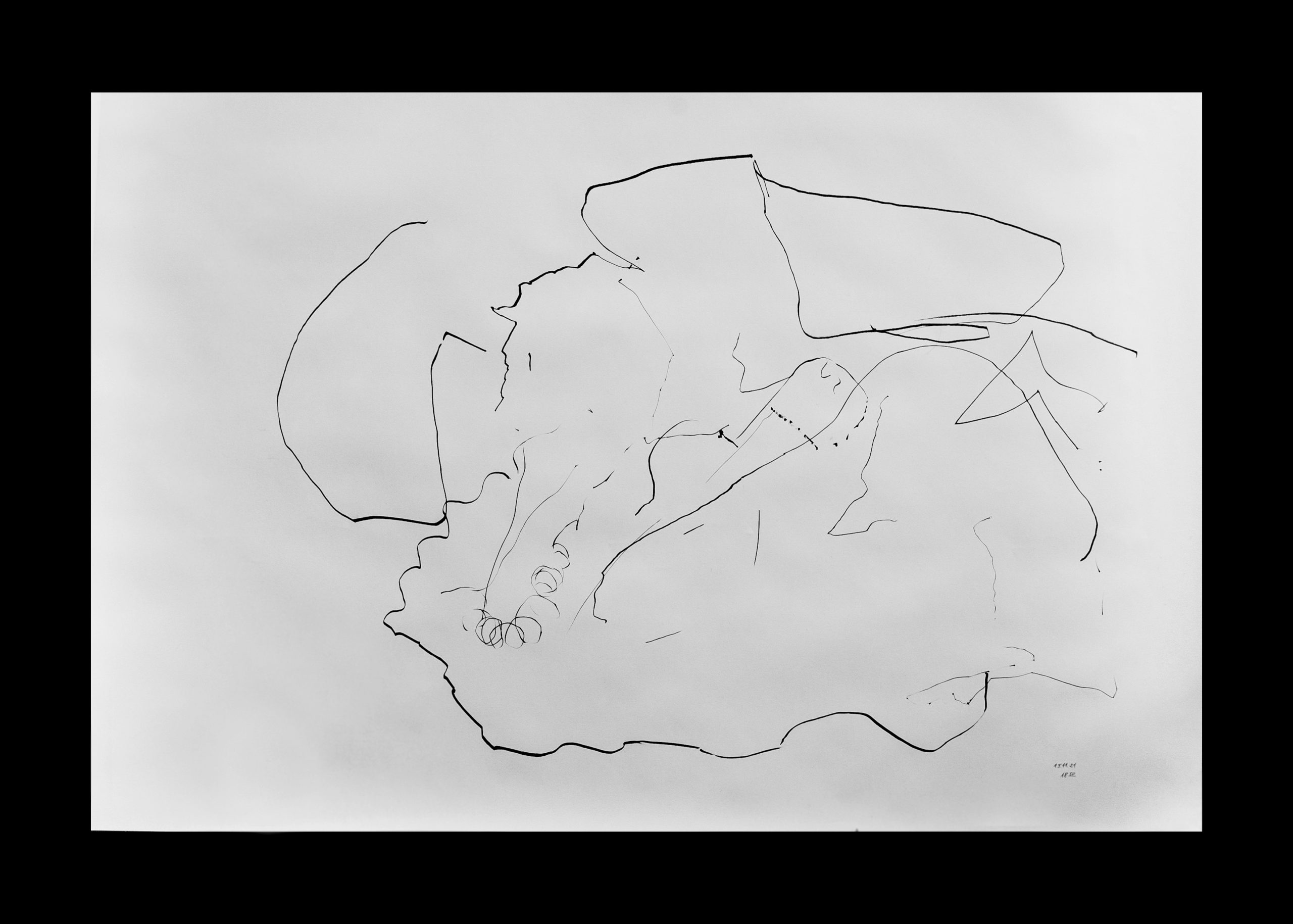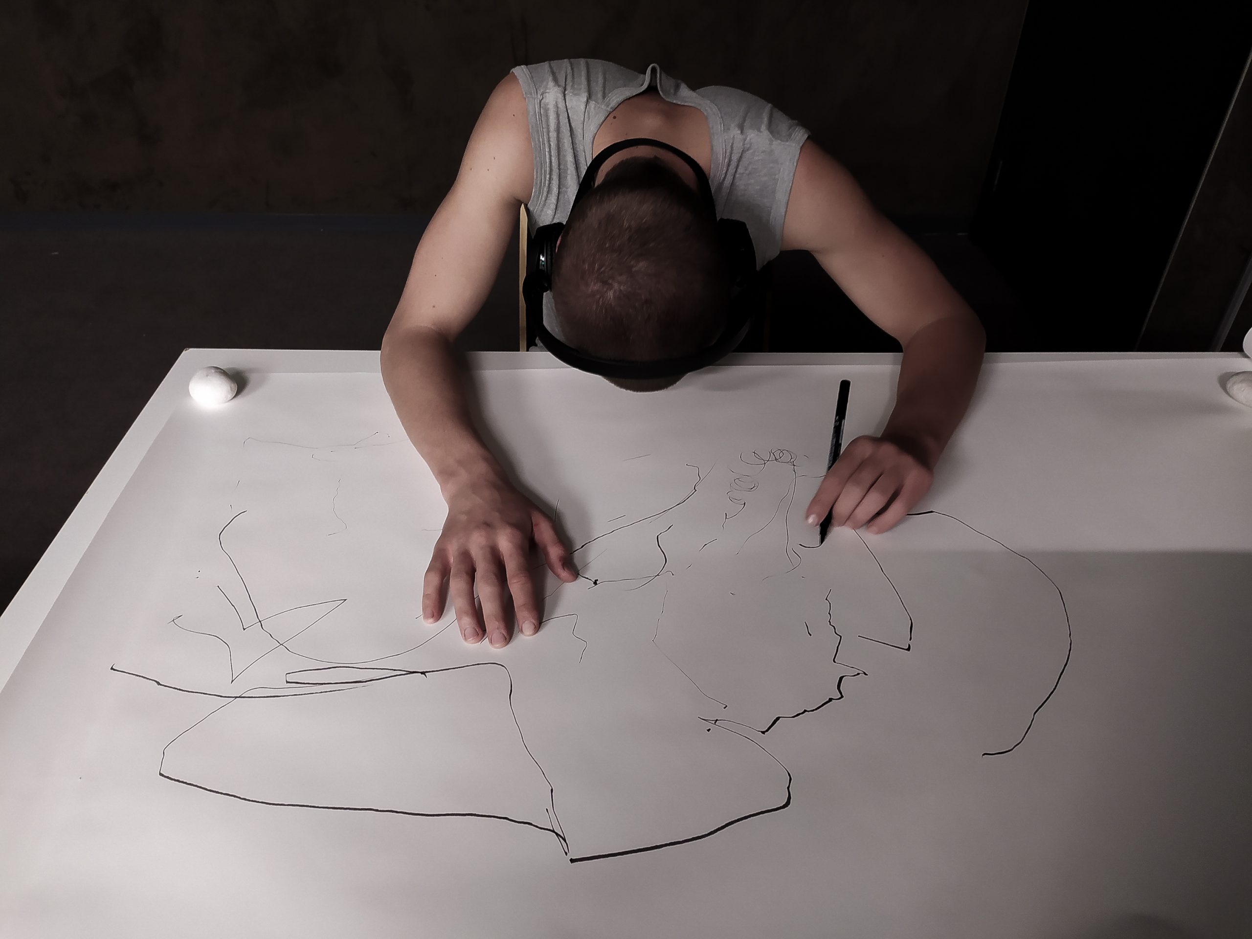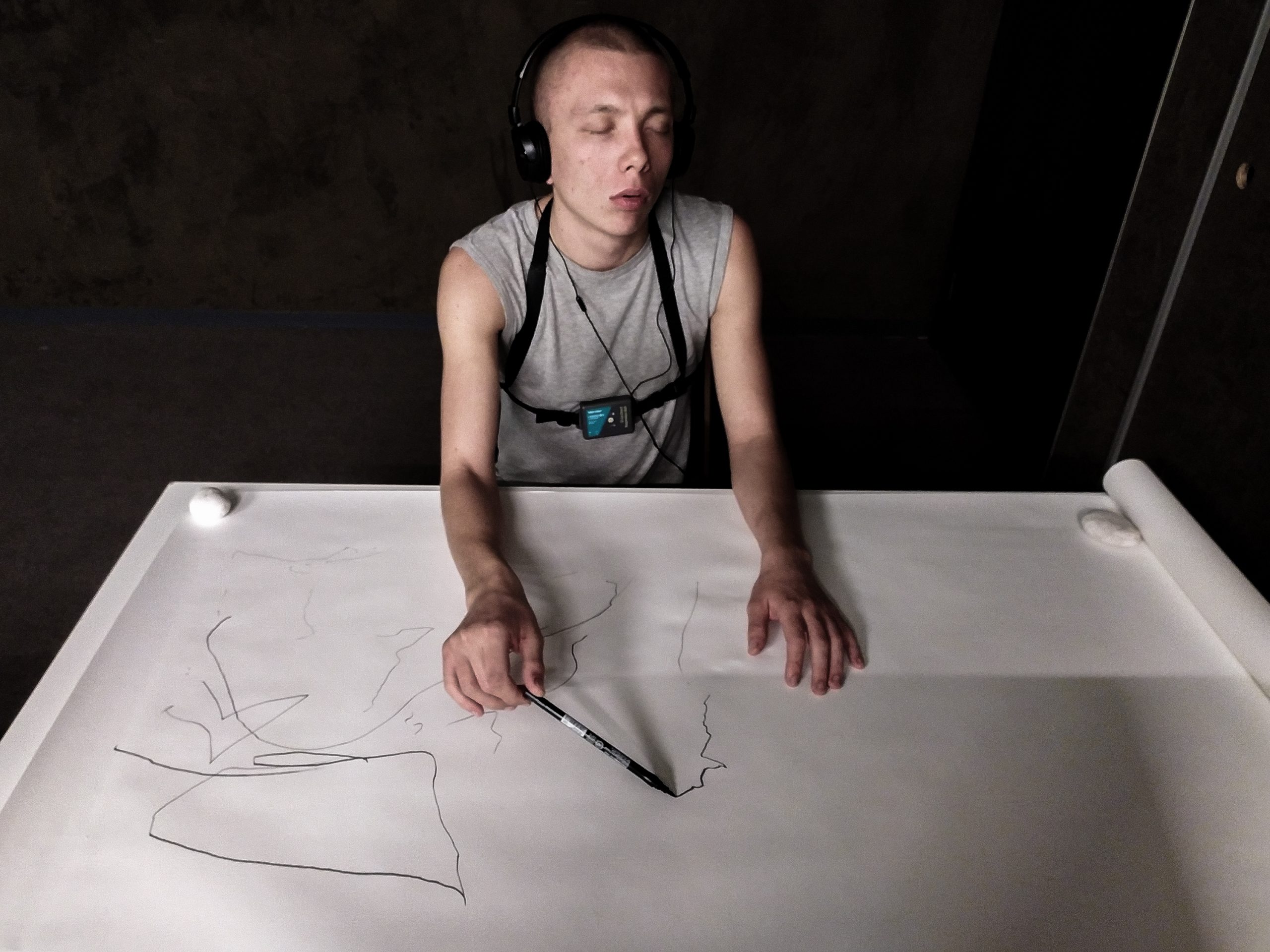 rys. Rysunek odręczny wykonany przez Kyryla Aleksandrova, powstały w trakcie doświadczenia oddechowo-rysunkowego z zamkniętymi oczami. Jest on częścią cyklu rysunków odręcznych uczestników wydarzenia DECH wykonanych na rolce papieru o wymiarach 10 m x 0,5 m.