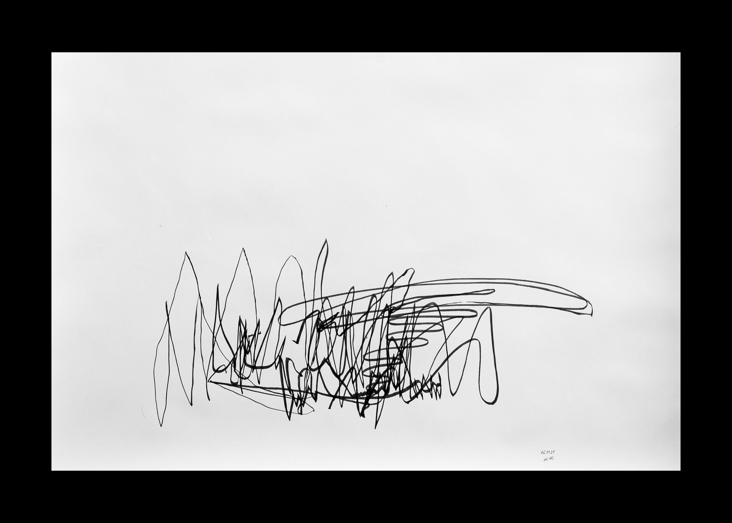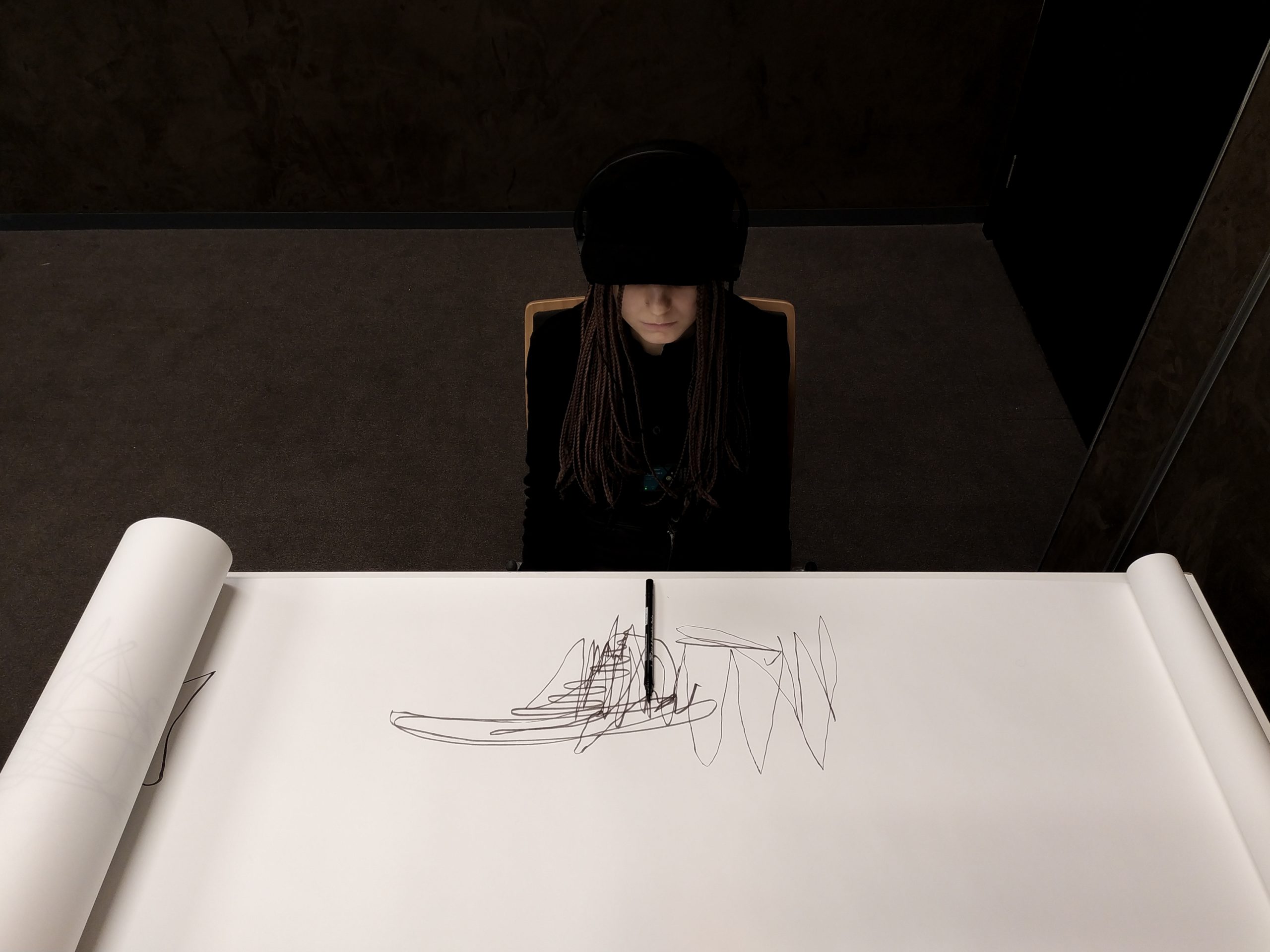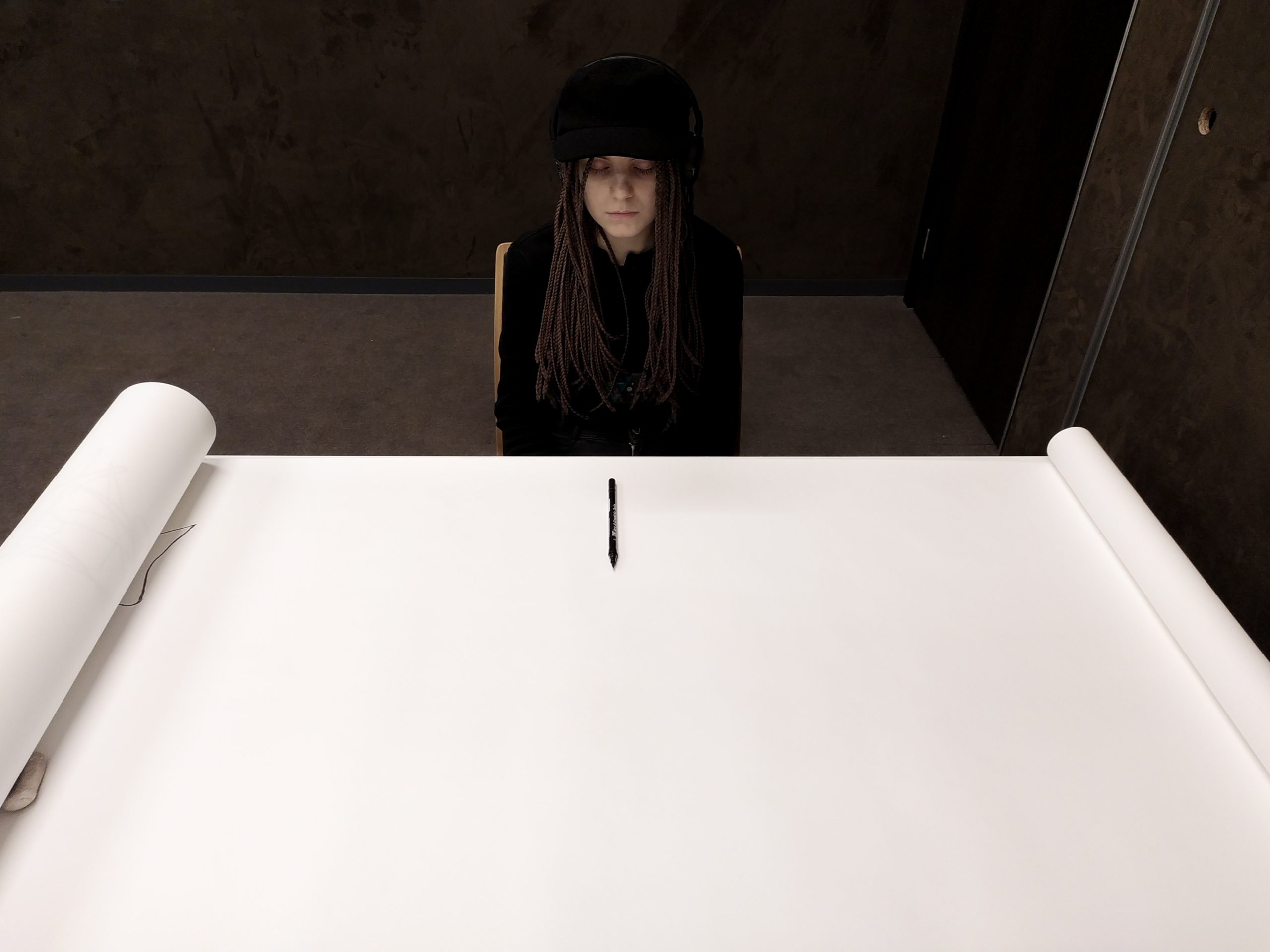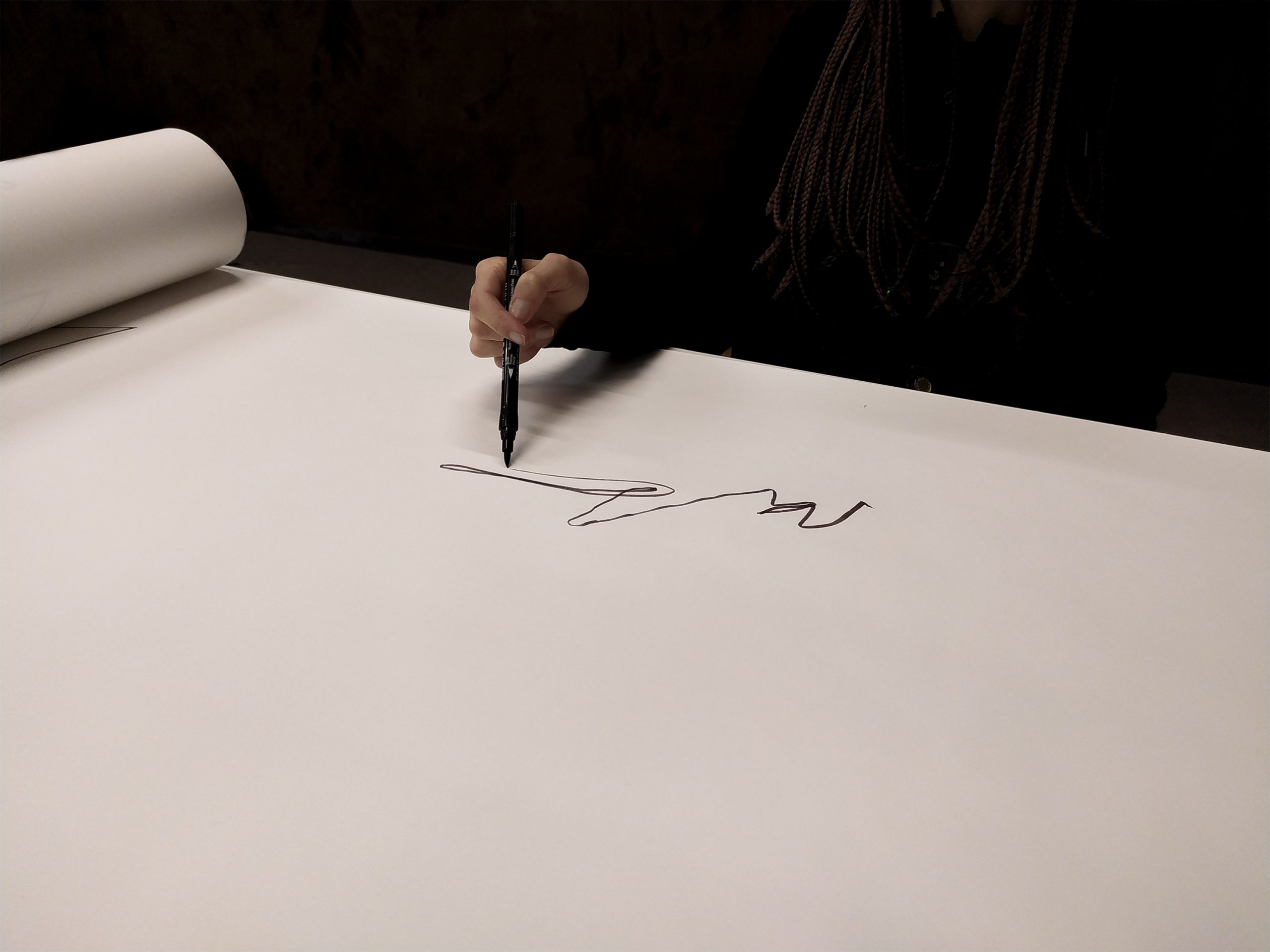 rys. Rysunek odręczny wykonany przez Alicję Szpilę, powstały w trakcie doświadczenia oddechowo-rysunkowego z zamkniętymi oczami. Jest on częścią cyklu rysunków odręcznych uczestników wydarzenia DECH wykonanych na rolce papieru o wymiarach 10 m x 0,5 m.