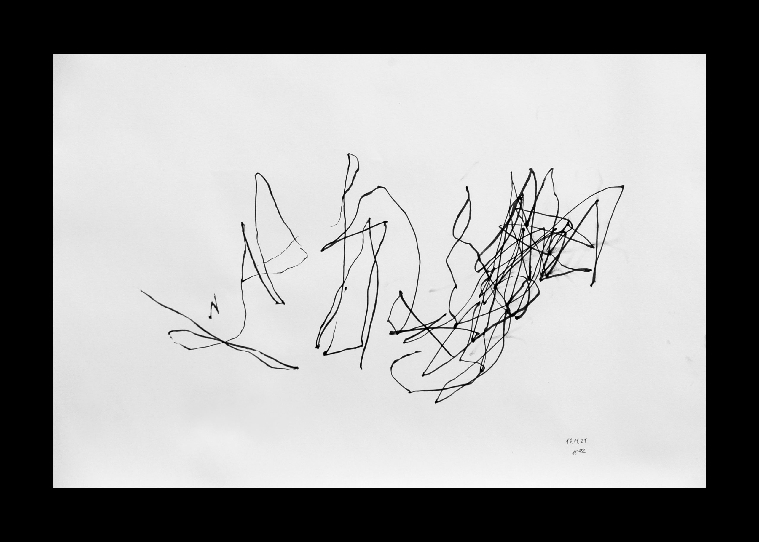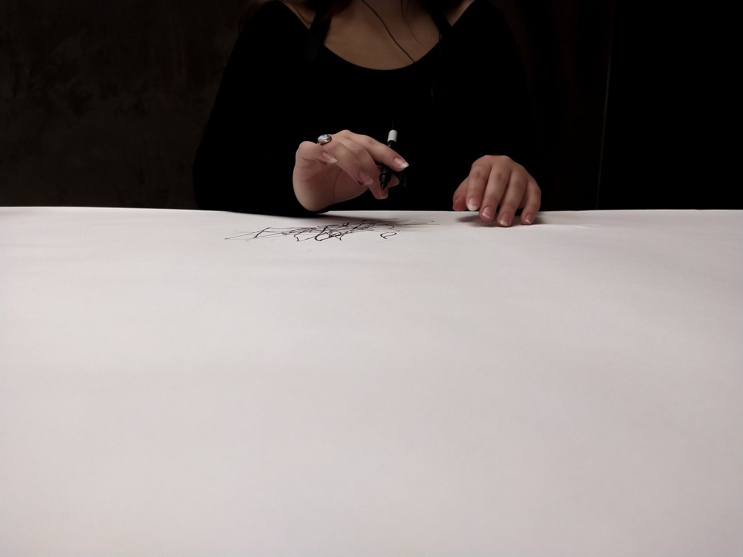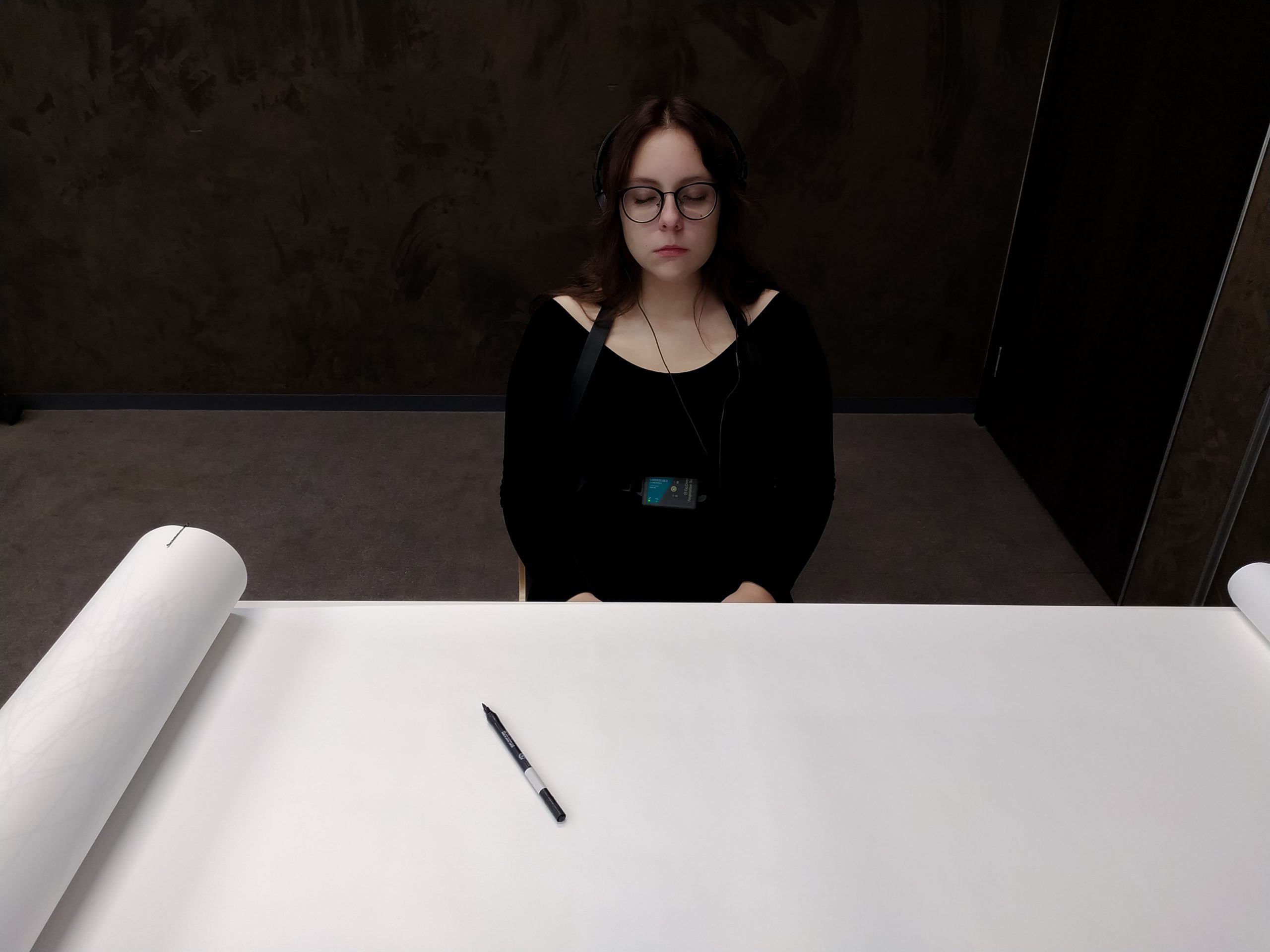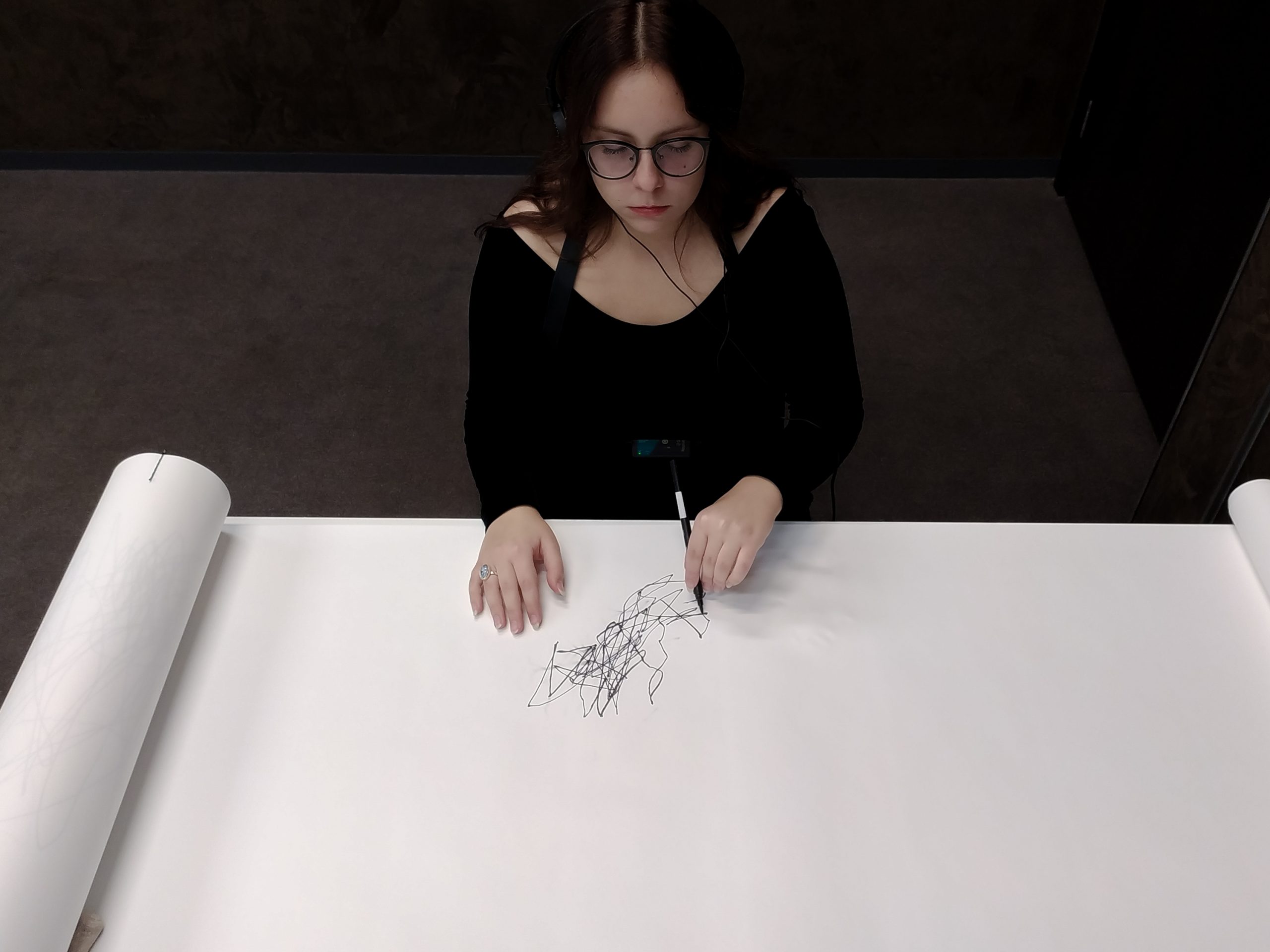 rys. Rysunek odręczny wykonany przez Aleksandrę Pienkosz, powstały w trakcie doświadczenia oddechowo-rysunkowego z zamkniętymi oczami. Jest on częścią cyklu rysunków odręcznych uczestników wydarzenia DECH wykonanych na rolce papieru o wymiarach 10 m x 0,5 m.