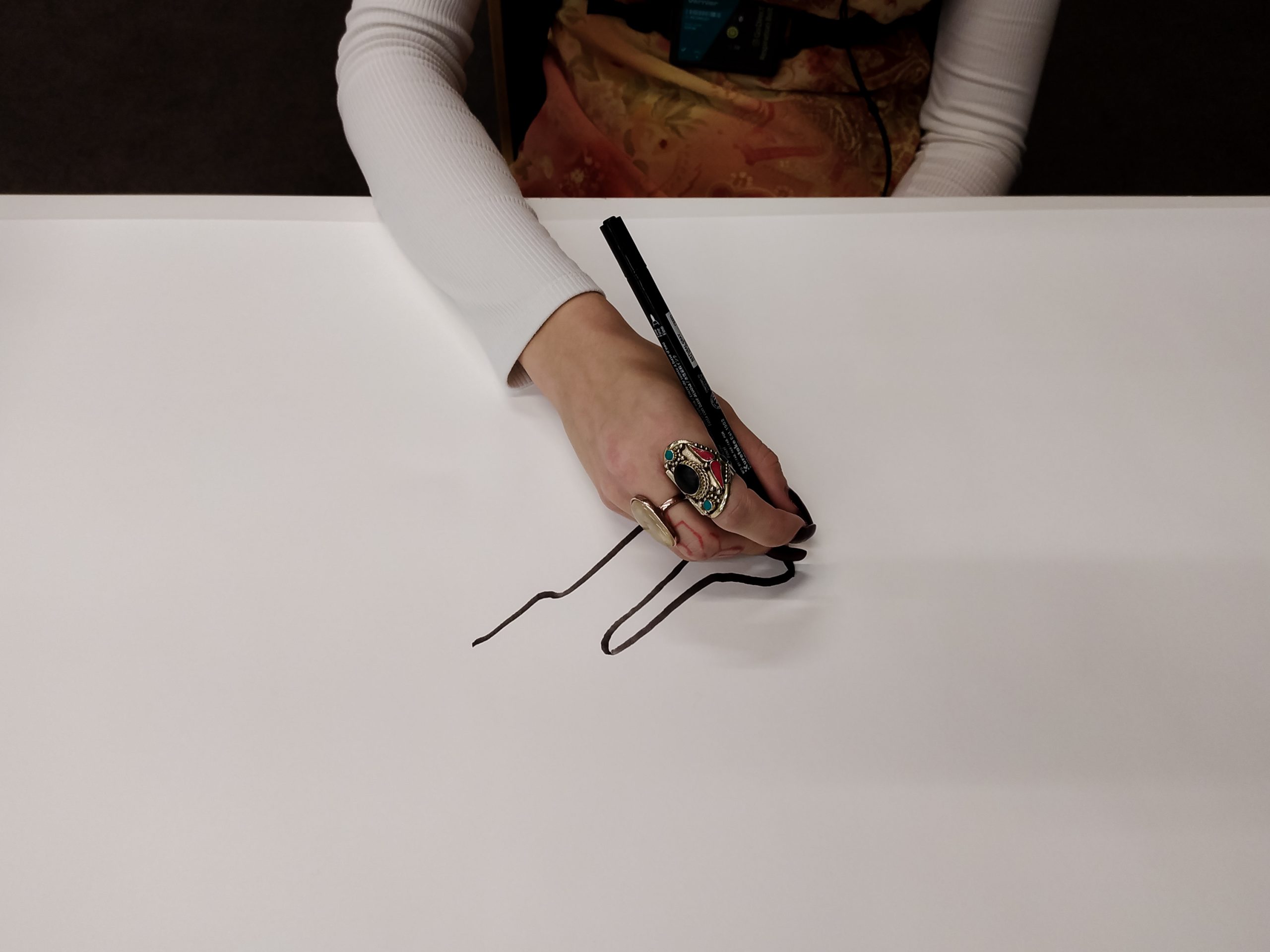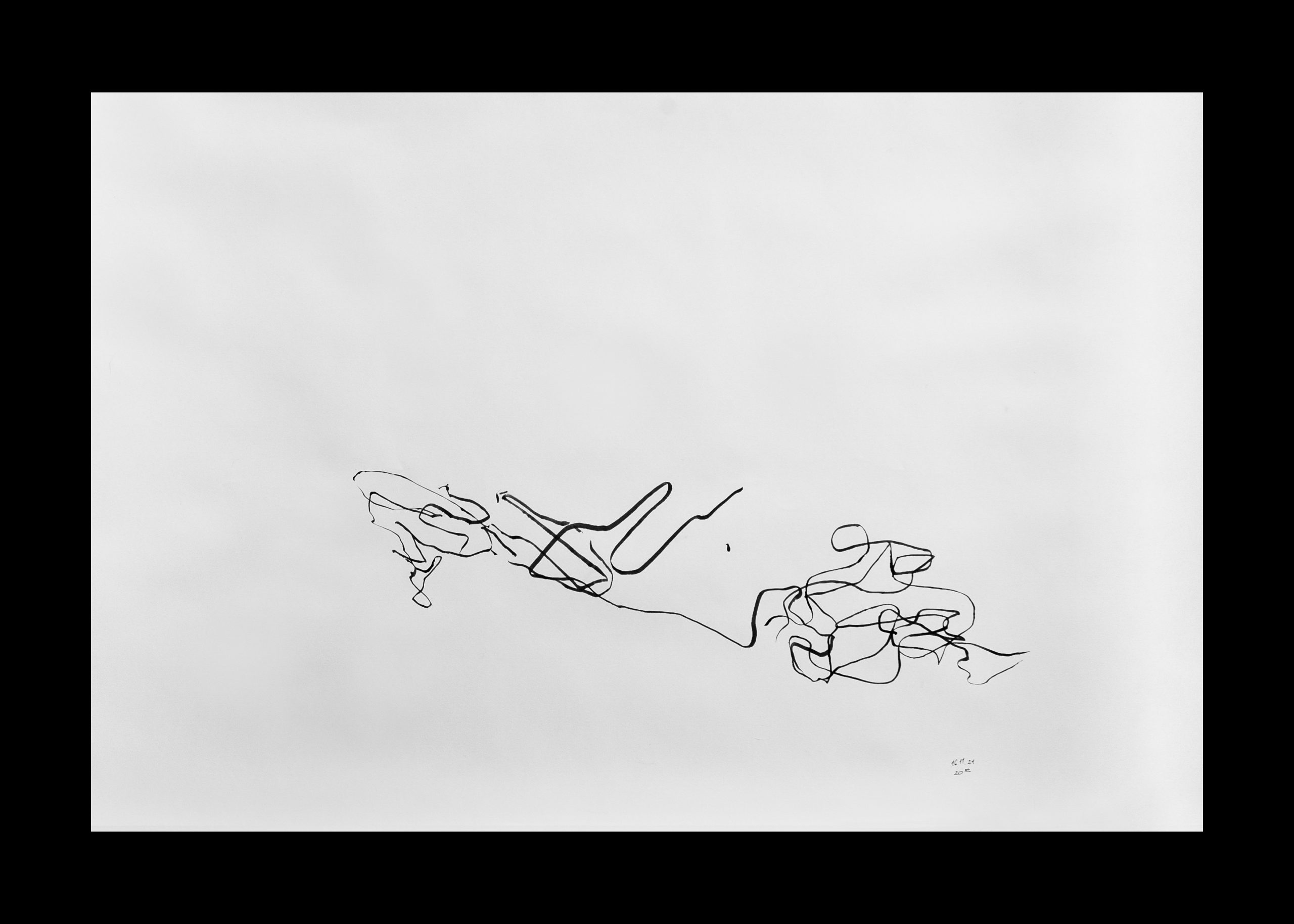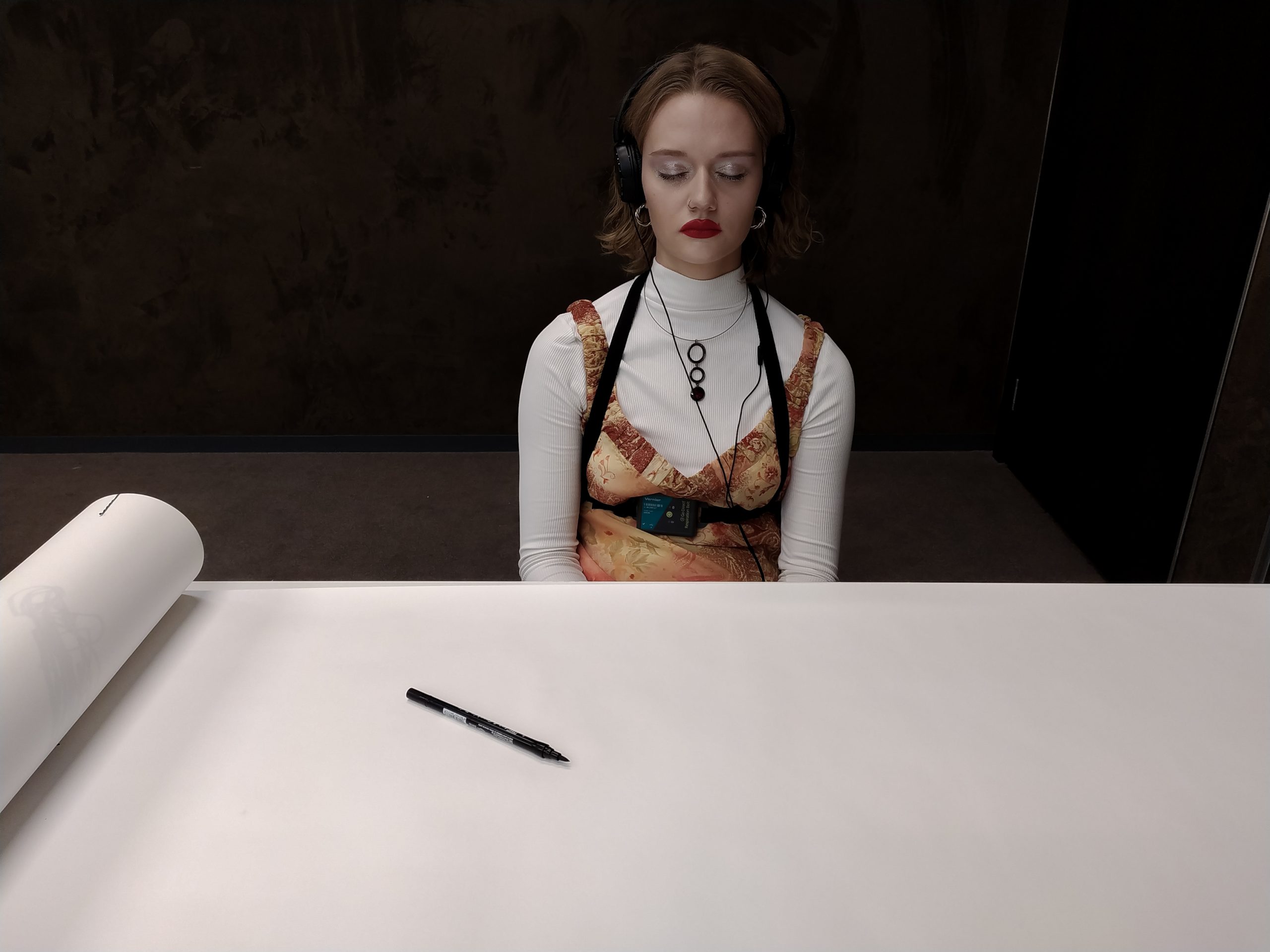 rys. Rysunek odręczny wykonany przez Zofię Kalembę, powstały w trakcie doświadczenia oddechowo-rysunkowego z zamkniętymi oczami. Jest on częścią cyklu rysunków odręcznych uczestników wydarzenia DECH wykonanych na rolce papieru o wymiarach 10 m x 0,5 m.