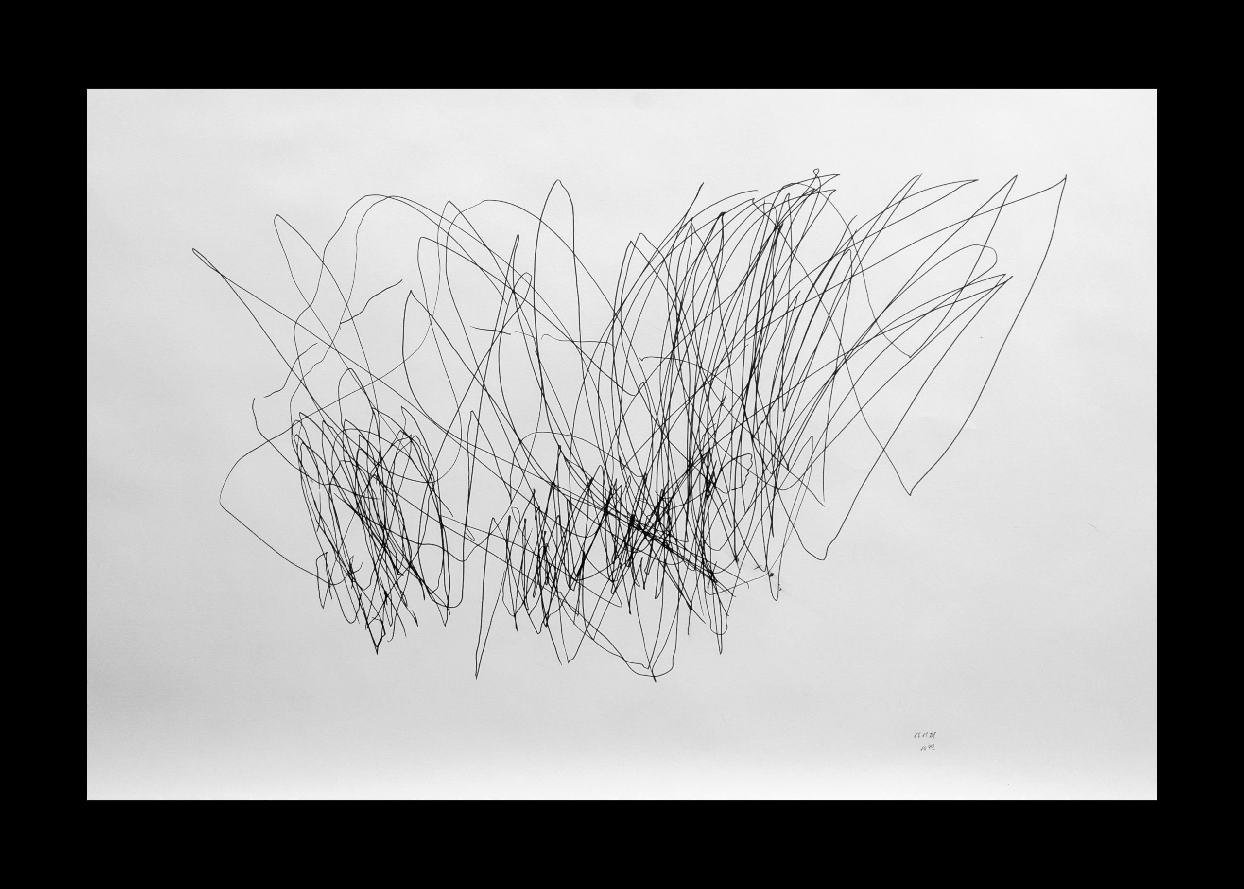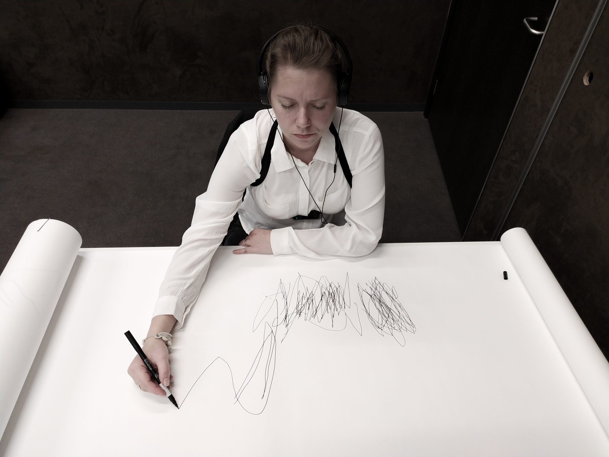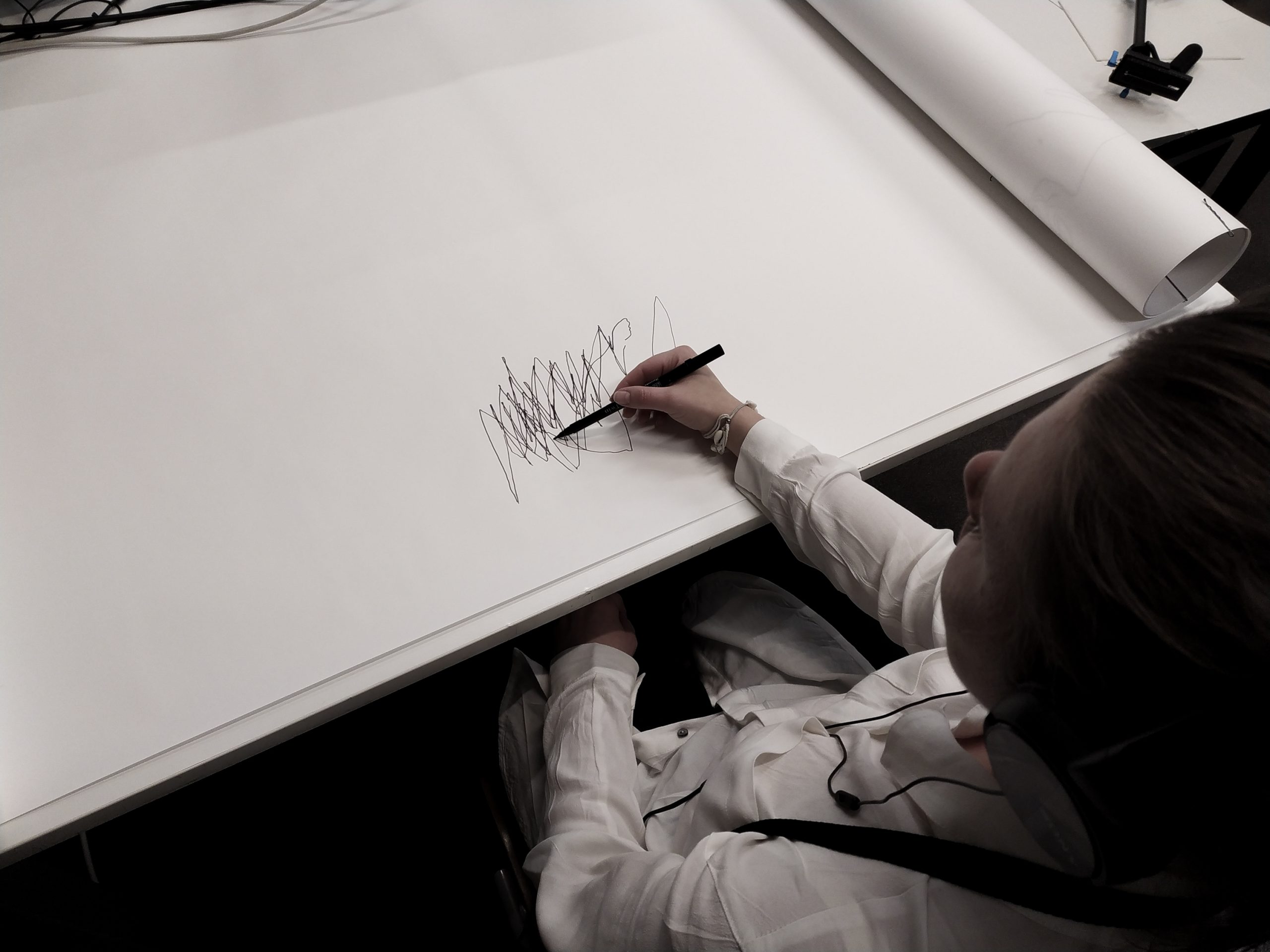 rys. Rysunek odręczny wykonany przez Aleksandrę Karczmarek, powstały w trakcie doświadczenia oddechowo-rysunkowego z zamkniętymi oczami. Jest on częścią cyklu rysunków odręcznych uczestników wydarzenia DECH wykonanych na rolce papieru o wymiarach 10 m x 0,5 m.